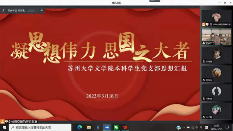 2022年3月18日,皇冠博彩官方 本科学生党支部以腾讯会议的形式,开展了“凝思想伟力 思国之大者”思想汇报交流会议,集体分享同学们在网课期间的思想学习成果和抗疫心得体会,支部全体党员参加了这次会议。
