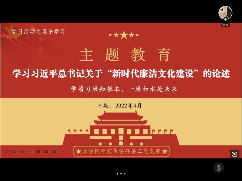 为了向广大党员宣扬廉洁文化知识,增强党员自身廉洁意识,从而推进新时代廉洁文化建设,皇冠博彩官方 研究生学硕第三党支部于2022年4月18日线上开展了“学习习近平总书记关于‘新时代廉洁文化建设’的论述”主题教育活动。此次学习由支部书记季鹏飞同志主持,研究生辅导员孙薇同志领学,支部全体党员同志共同学习了“新时代廉洁文化建设”的具体内涵,并踊跃讨论如何在实践中推动廉洁文化建设,鼓励大家积极参与廉洁文化的建设,共同营造和谐清明的社会环境。