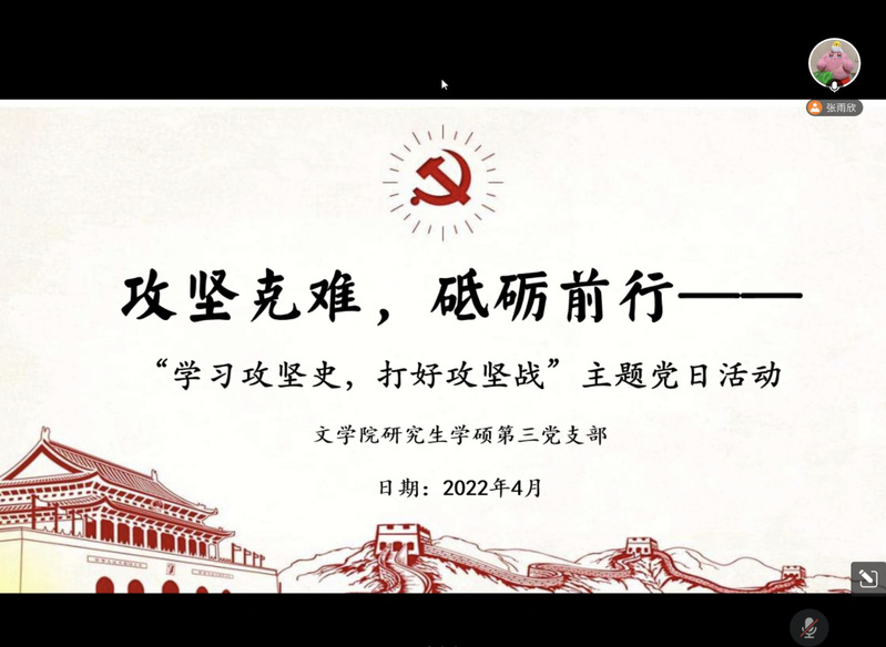 “十三五”期间,我们聚焦全面建成小康社会目标,固根基、补短板、强弱项,脱贫攻坚战取得全面胜利,污染防治攻坚战效果显著,防范化解重大风险攻坚战取得成效,三大攻坚战取得决定性成就。新的征程上,我们要实现第二个百年奋斗目标,更加需要坚持和发扬维护党中央权威和集中统一领导的历史经验,特别是党的十八大以来的新鲜经验,从历史规律性和历史主动性统一的高度,统筹推进“五位一体”总体布局、协调推进“四个全面”战略布局历史新要求,深刻领会实现中华民族伟大复兴的历史必然性,抓住历史机遇,创造更加伟大的事业。值此之际,皇冠博彩官方 研究生学硕第三党支部于2022年4月21日线上开展了“学习攻坚史 打好攻坚战”主题党日活动。此次主题党日活动由支部书记季鹏飞同志主持,支部全体成员参加。