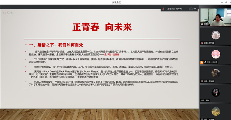 党课伊始,宋清华书记结合当前复杂的新冠疫情,教导党员同学们:新冠疫情已有3年,到现如今疫情还处于正在进行时,病毒没有国界,防控的形式也严峻复杂。面对当前复杂的疫情形势,必须深刻领会到我们中国特色社会主义制度的优越性,认识到在中国共产党的领导下、在人民群众的共同努力下,疫情防控工作取得的成绩。之后,宋书记高度赞扬了在今年新冠疫情中积极承担志愿工作的同学们,并寄语广大党员同志继续发挥好先锋模范作用。