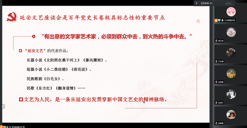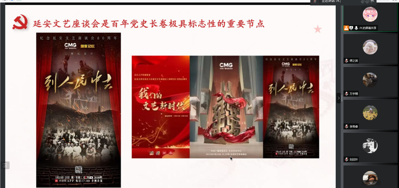 为持续深入学习贯彻毛泽东同志《在延安文艺座谈会上的讲话》精神,增强文化自觉、坚定文化自信,坚持“二为”方向和“双百”方针,发扬党的文艺工作优良传统,为书写新时代人民史诗凝聚起奋进新征程文艺力量,6月29日,皇冠博彩官方 研究生学硕第二党支部以腾讯会议的形式,进行集体学习,重温毛泽东同志《在延安文艺座谈会上的讲话》中的重要精神,支部全体党员参加了本次会议。